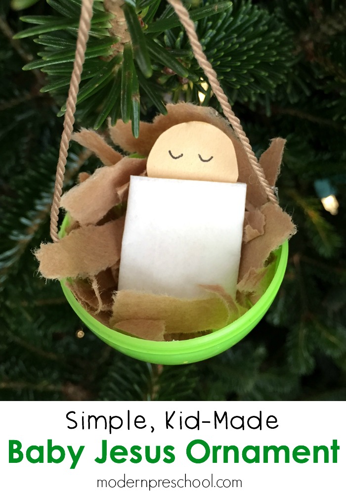And I just love watching my preschoolers read their own versions of the stories to each other! Our plastic egg baby Jesus ornament was inspired by the book, Silent Night: My First Nativity Story by Julie Fletcher. It has simplified the story of baby Jesus being born to a preschool level, and the illustrations are perfect!