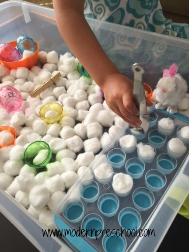 Add the cotton balls to the sensory bin along with the other accessories. Show your preschoolers how to open and close the plastic eggs, twist the wind-up bunnies, and add bunny tails to the ice cube trays one by one. Set the bin up in an inviting way to get your little ones playing and learning!